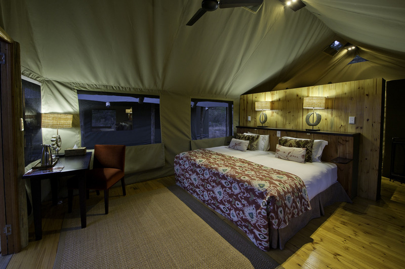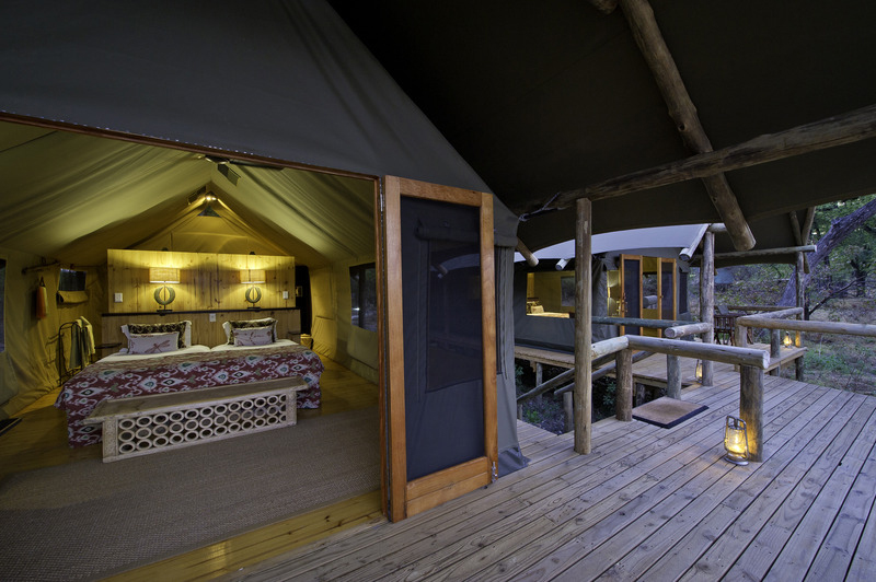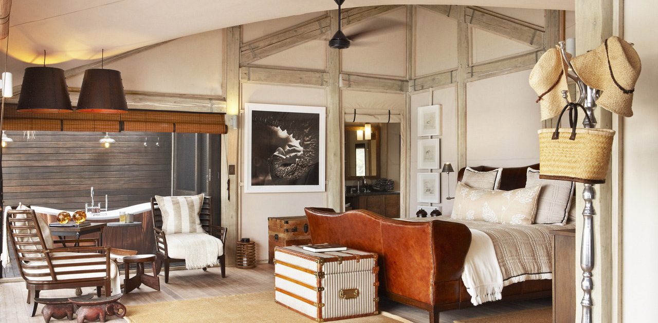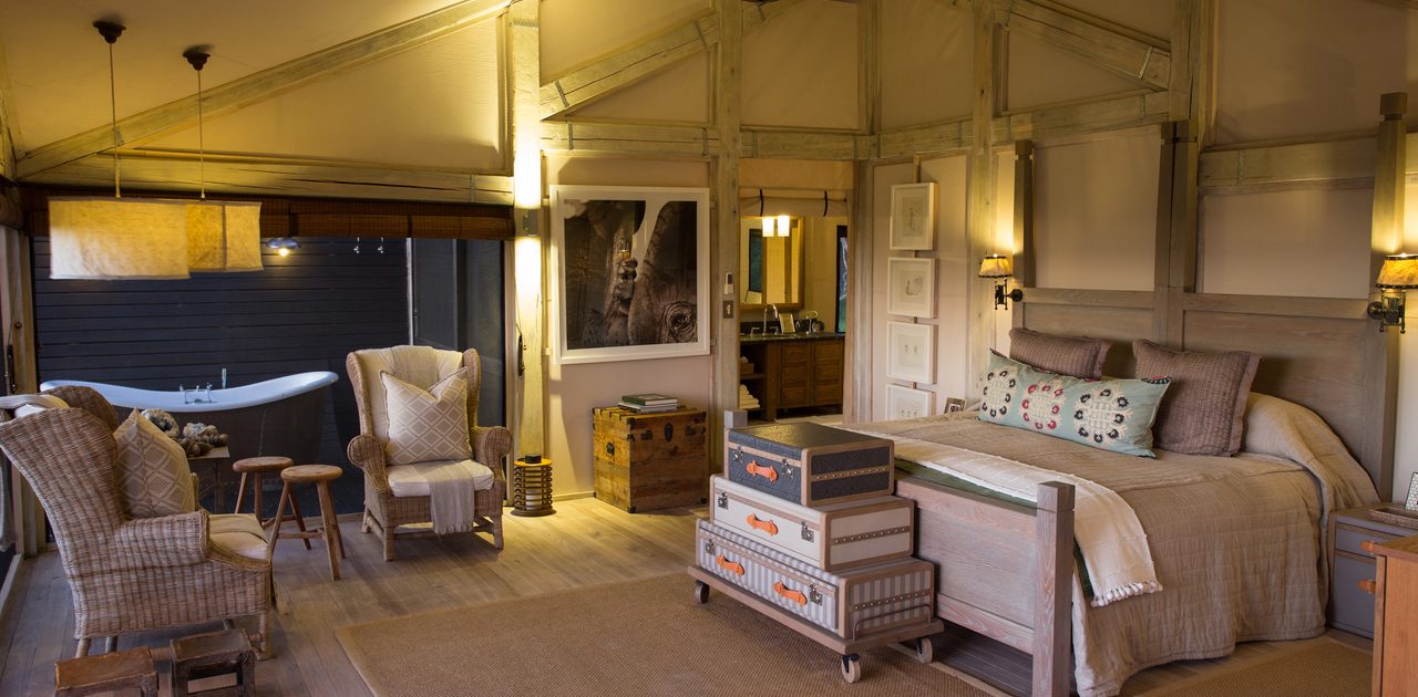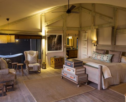 Caminos bien iluminados comunican el área del campamento principal con las habitaciones de los huéspedes. Utilizando una misma estética de carácter única, espaciosa y desenfadada en todo el campamento, las seis habitaciones exhiben su propia elegancia que las diferencia. Integradas en el entorno natural, cada tienda dispone de amplias terrazas y de ducha exterior e interior. El estiloso mobiliario y los accesorios, escogidos de forma individualizada para cada habitación, transmite una sensación de opulencia en su emplazamiento en la sabana.
