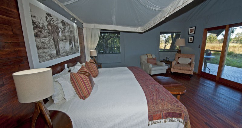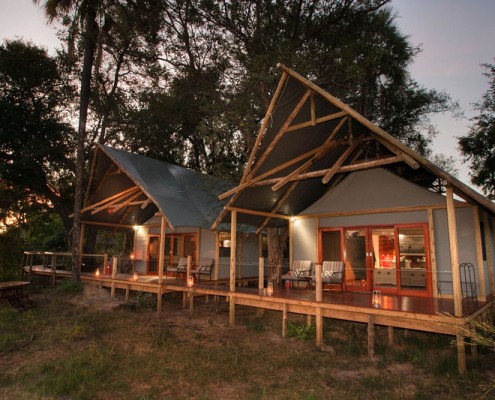 Sus 2 alojamientos familiares disponen de habitaciones contiguas y baño privado. La totalidad de las cinco tiendas de estilo Meru son espaciosas y están construidas sobre terrazas elevadas del suelo. Los baños de las habitaciones disponen de ducha exterior y vistas panorámicas al Delta del Okavango.