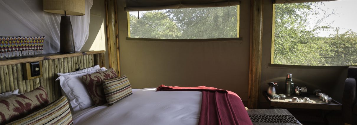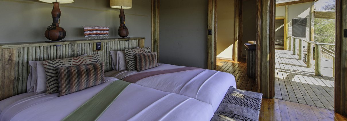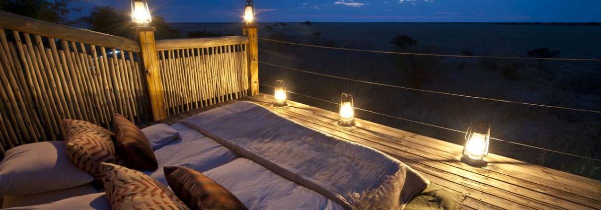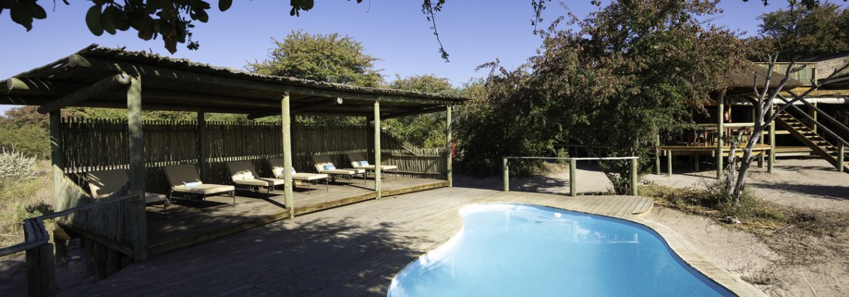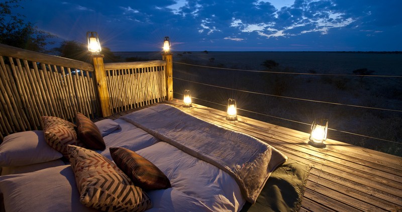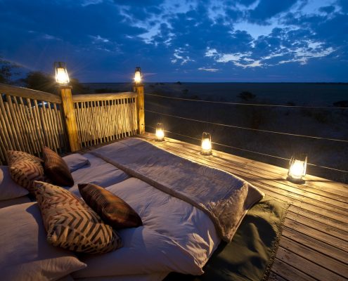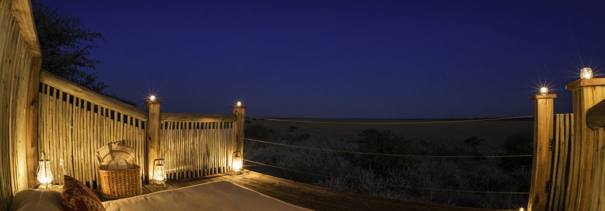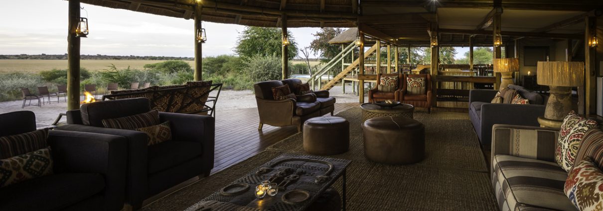 Las tiendas y la zona principal del campamento están elevadas del suelo para disfrutar de la brisa y de las envolventes vistas del Kalahari.