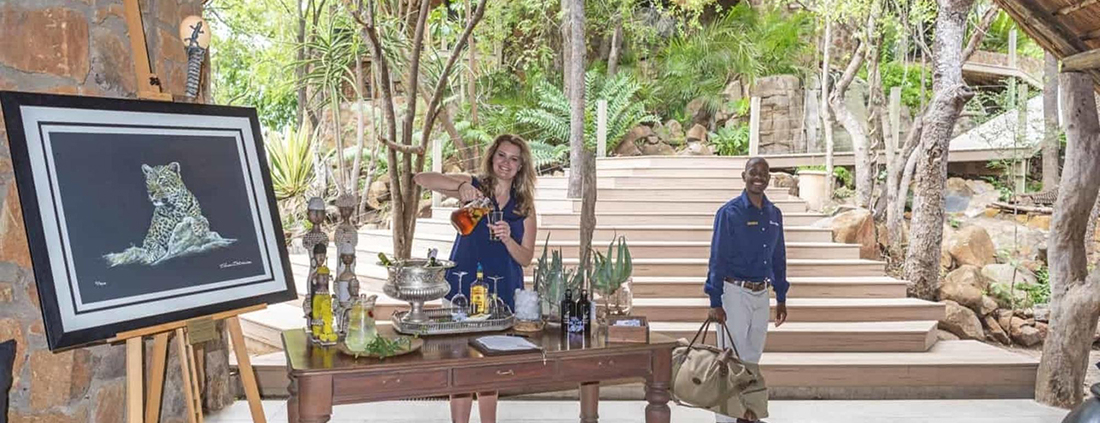 El Lodge de lujo de 5 estrellas, con excelente comida, excelente cocina y una extensa bodega de vinos, está situado en un Santuario en la cima de una colina con vista a un pozo de agua natural, y cada una de las 8 suites con aire acondicionado y frente de vidrio, con piscinas privadas tienen vistas espectaculares a la sabana boscosa.