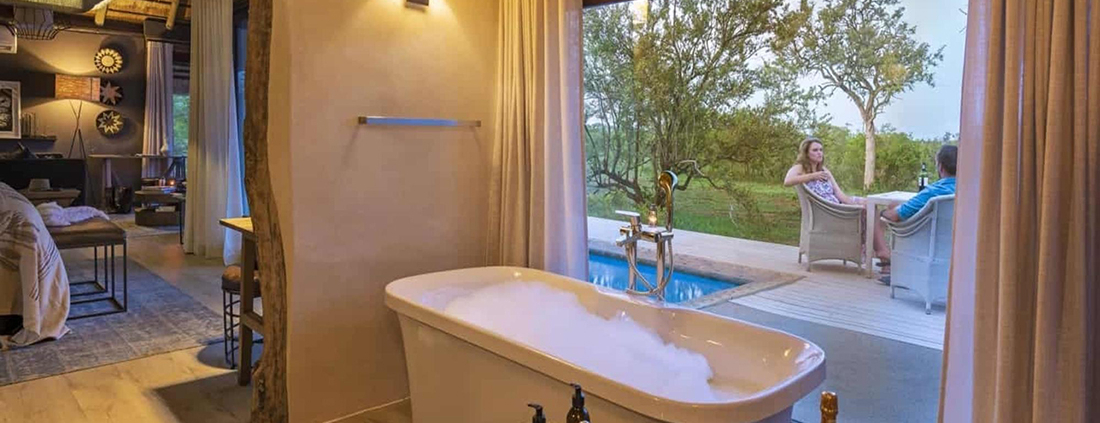 Un acogedor salón con impresionantes vistas a la sabana africana crea el escenario ideal para relajarse con un libro o pasar la tarde con un par de binoculares en la comodidad de su suite, donde, gracias al aire acondicionado, disfrutrá de un respiro del calor del sol del mediodía. Disfrute de la privacidad de su suite y rinda homenaje a la atemporalidad de África con una bebida o un refrigerio de su minibar completamente surtido. Disfrute del día en su hamaca o tumbona de la piscina al aire libre, mientras escucha el tranquilo sonido de la sabana que lo rodea.