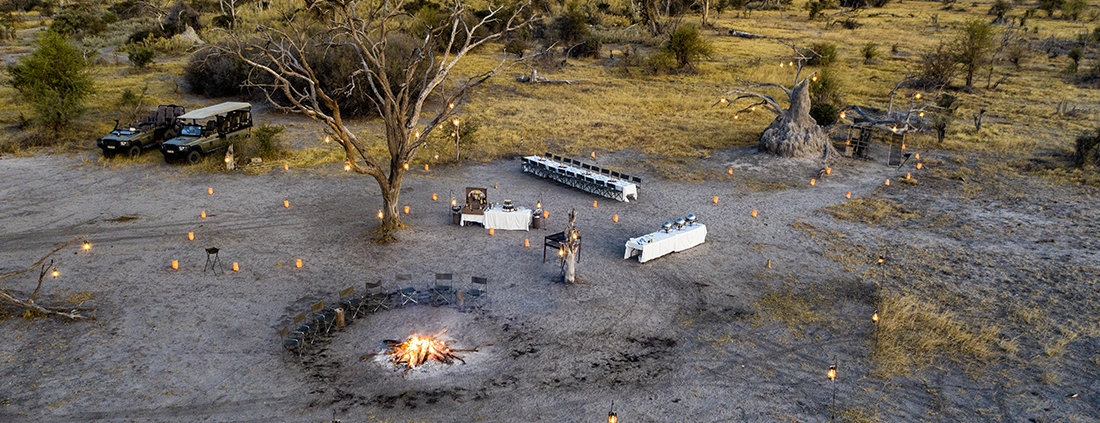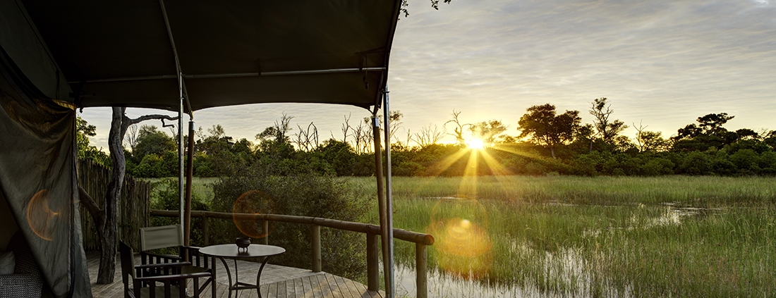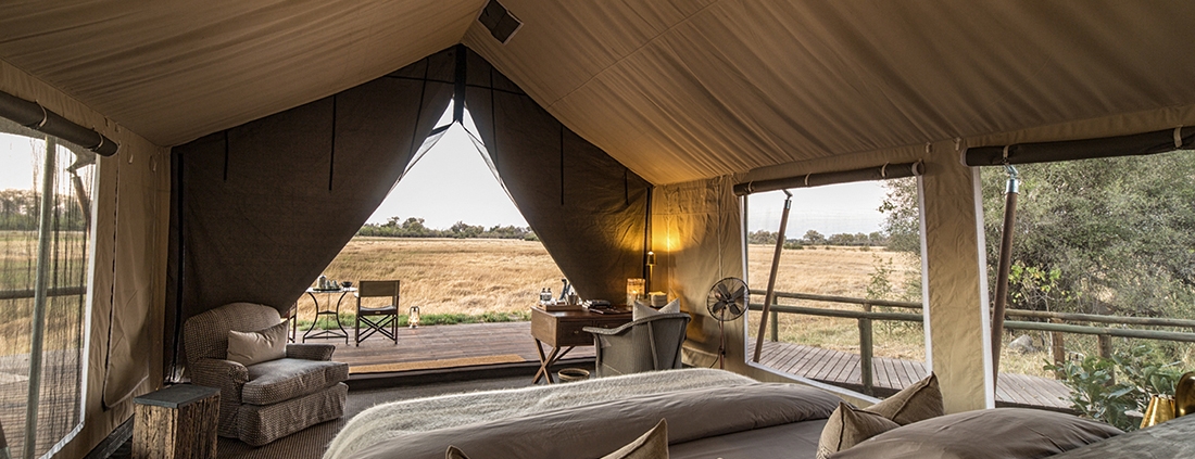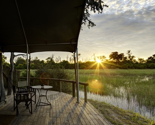 Está construido en el estilo clásico de la década de los años 50, con tiendas de safari de lujo, baños en-suite y zonas de estar, sin olvidar las románticas duchas al aire libre. Todas las tiendas están situadas en cubiertas y los caminos a las tiendas serpentean entre los grandes árboles. La zona principal de comedor y bar también se encuentran sobre cubiertas de madera con vistas a una gran llanura inundada.