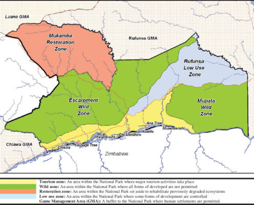 El PN Lower Zambezi es grande en extensión (unos 4.000 km2), pero la concentración de vida salvaje se encuentra en la zona del valle tectónico por el que fluye el río (área marcada en amarillo en el mapa). El resto de la superficie del PN está ocupada por una cadena montañosa de grandes acantilados boscosos que llegan a alturas de 1.200 m, y con pocos puntos permanentes de agua, entorno poco apto para la mayoría de especies de vida salvaje.