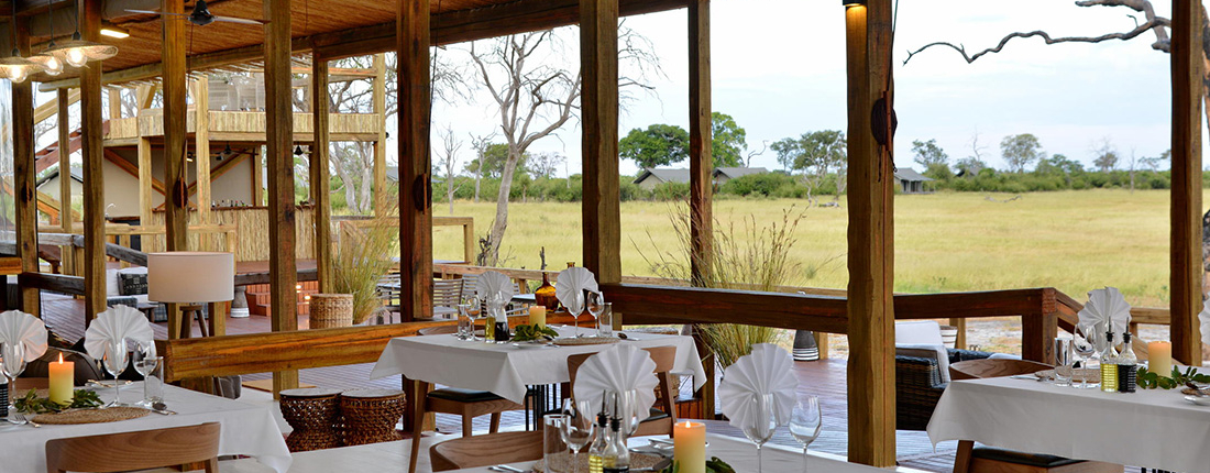 El Nogatsaa Pans Chobe Lodge cuenta con un gran restaurante totalmente abierto frente al estanque, y ofrece un menú creativo y delicioso que presenta platos creativos y bellamente preparados para cenas de 3 platos. Fragancias, texturas y sabores se reúnen en un trío de platos que se disfrutan bajo en el comedor iluminado por velas con serenatas de los hipopótamos residentes.