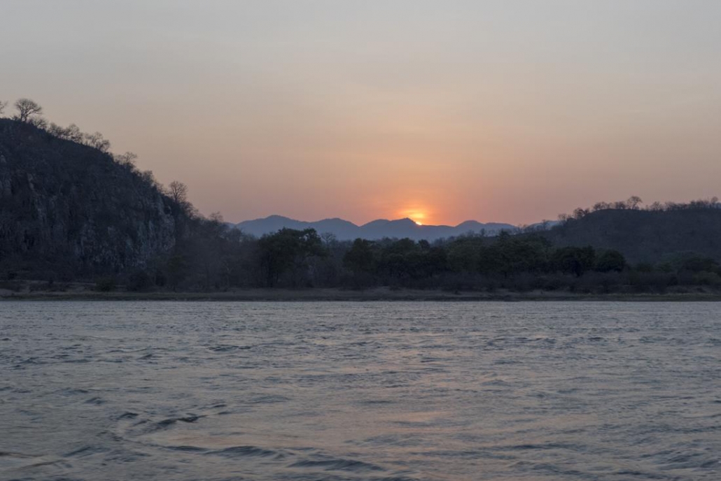 La verdad es que los últimos 10-15 minutos del traslado en lancha, navegando el río Zambezi, ahora retrocediendo por el río hacia el este, que en este tramo discurre encastrado entre montañas, con Zimbabwe a nuestra derecha y Zambia a la izquierda según el sentido de nuestra navegación hacia el lodge, y una mágica puesta de sol, nos levantó muy rápidamente el ánimo y nos hizo olvidarnos de la larga ruta y el polvo del camino: un momento realmente mágico.