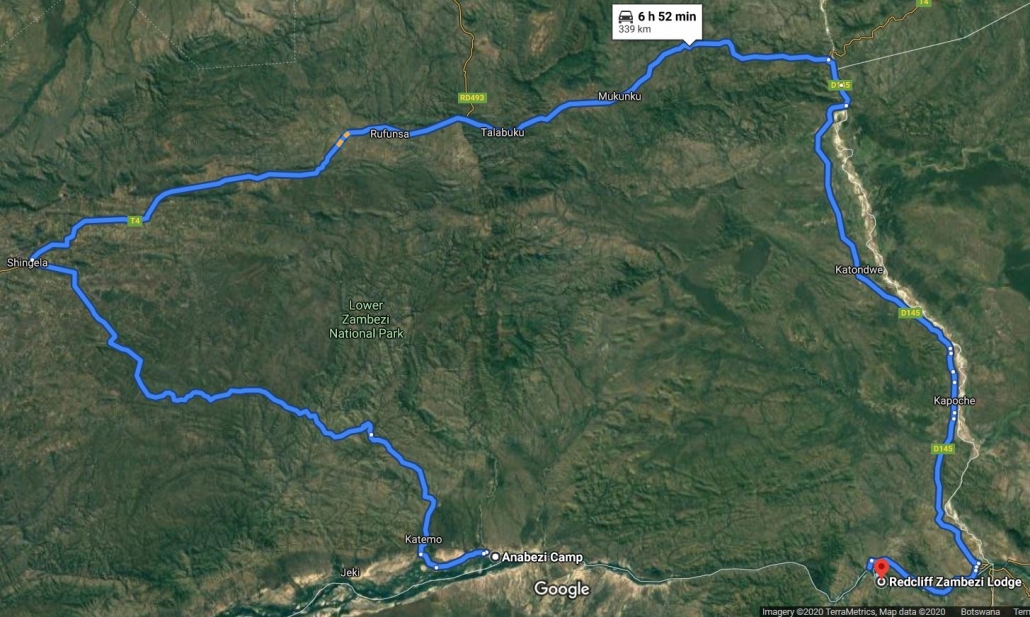 Así que sobre las 10 de la mañana, tras finalizar el crucero y disfrutar de un buen desayuno, nos pusimos en marcha para afrontar los algo más de 300 km bordeando Lower Zambezi. Según Google Maps, necesitaríamos unas 7 horas para cubrir esa distancia.