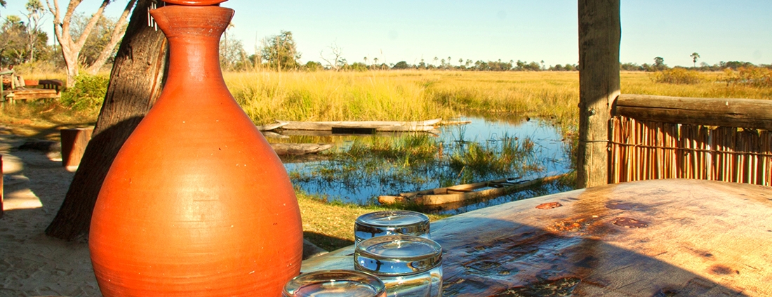 Durante el tiempo de descanso entre safaris puede disfrutar de una bebida en el bar o en el lounge mirando a la laguna y los canales del Delta.