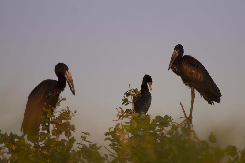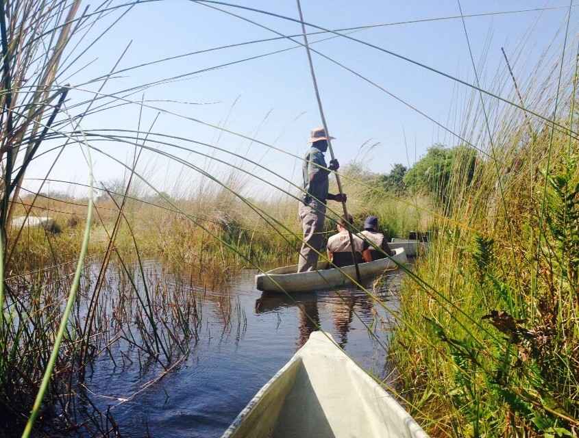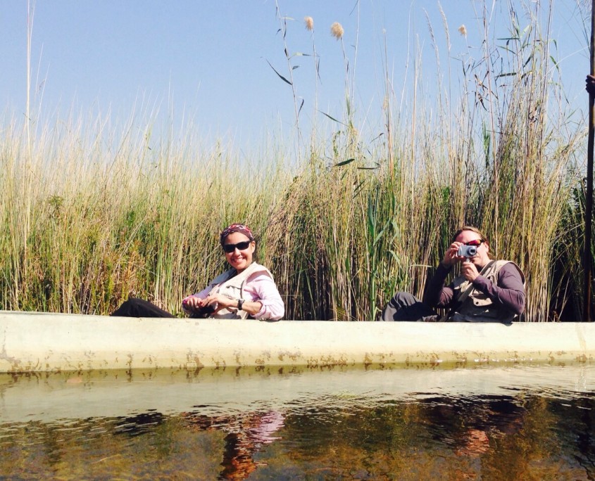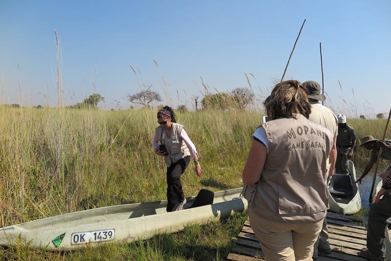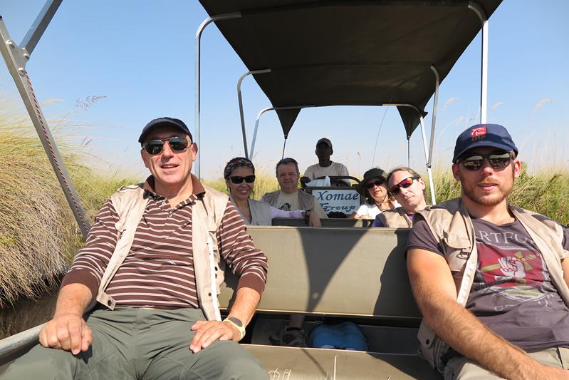 Cuando regresamos, los leones están tumbados a la sombra, pero en muy mala posición para tomar fotos. Les observamos un rato, y continuamos hacia el embarcadero, donde los mokoros nos esperan para un relajado paseo por los canales del Delta. De regreso, almorzamos  nuestro pack-lunch antes de tomar las lanchas que nos llevarán a la isla en el Delta del Okavango. Observamos varias aves entre la vegetación de los canales, y algún «bebé» cocodrilo. Disfrutamos de la belleza del paisaje en nuestro recorrido.