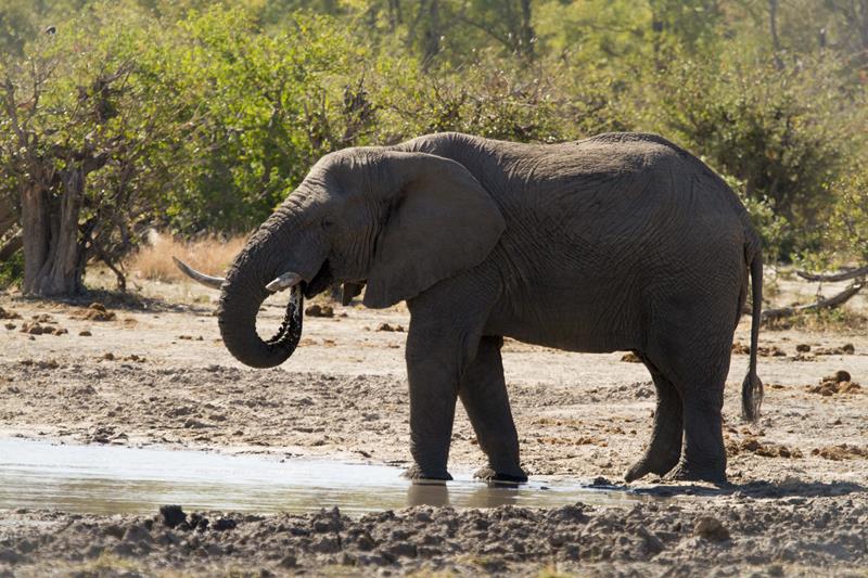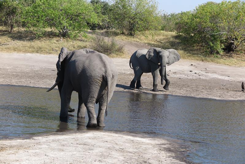 Seguimos hacia el Parque Nacional Chobe, atravesando la concesión de Khwai. En el punto donde cruzamos el río Khwai un elefante enfrente se muestra disgustado. El coche se acerca mientras bebe y esto no parece gustarle. Mejor no acercarse y continuar nuestra ruta.