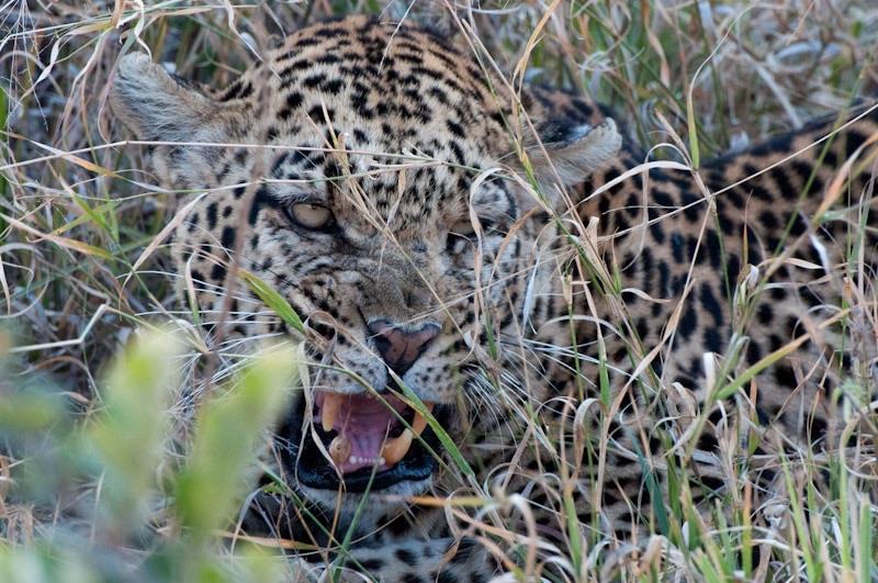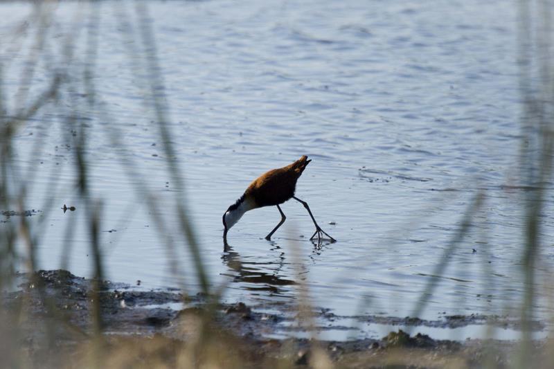 Tras nuestro almuerzo, el primero al aire libre, seguimos nuestra ruta hacia el Third Bridge. Tomamos la ruta larga y exploramos tranquilamente. Bordeamos las lagunas y algunos letchwes saltan asustados al oir el coche. Las jacanas se pasean por el agua a su aire. Vemos un joven leopardo dormitando a la sombra de un termitero, pero tan esquivo y rápido, que no me da tiempo a hacer la foto. Pero no importa, el corazón nos da un vuelco a todos al encontrar un leopardo en nuestro primer día. Quien haya hecho safaris con anterioridad, sabe de lo que le hablo.