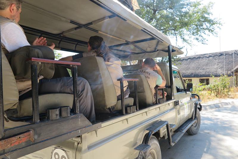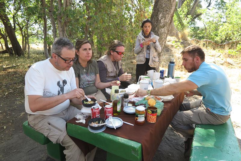 Hemos realizado varias paradas para disfrutar de los avistamientos: manadas de jirafas, elefantes, impalas, cebras, etc. Llegamos a la Puerta Sur de Moremi ya con las tarjetas de las cámaras repletas de fotos. Y aquí paramos para tomar nuestro almuerzo y realizar el control de entrada a la Reserva. Como no, los toco de pico amarillo nos acompañan durante nuestra comida, listos a pillar cualquier resto que caiga al suelo. Por supuesto no les alimentamos, pero ellos ya han aprendido que los que paran allí, comen.