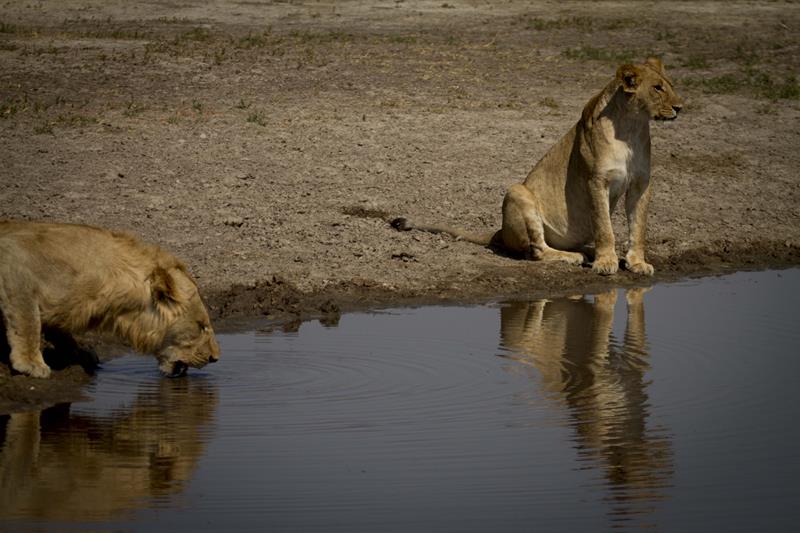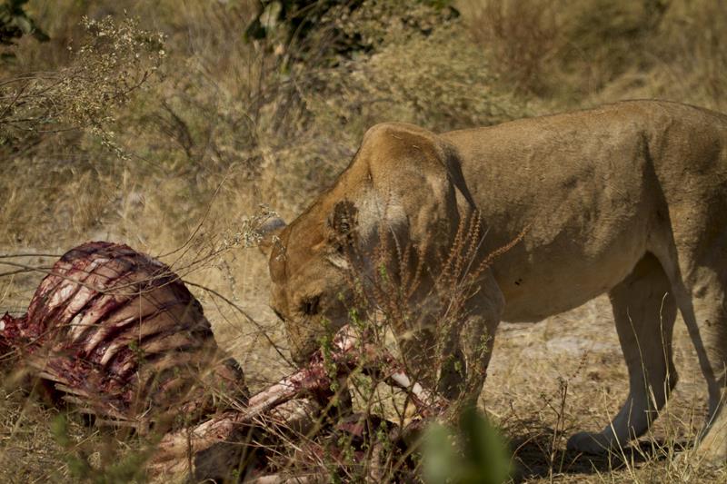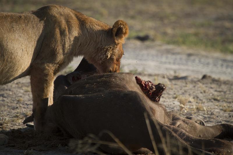Sabemos que vamos a llegar muy tarde al embarcadero, pero aún así, paramos a tomar un café para poder volver a ver a los leones con su presa. Una vez que los elefantes se hayan alejado, los leones retornarán a vigilar su presa, para evitar que otros carroñeros como hienas o buitres, traten de reclamarla como suya. Mientras los leones estén cerca, los carroñeros no se acercarán. Y estos 2 leones lo saben muy bien.