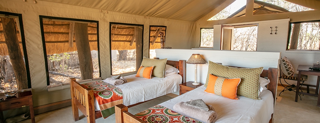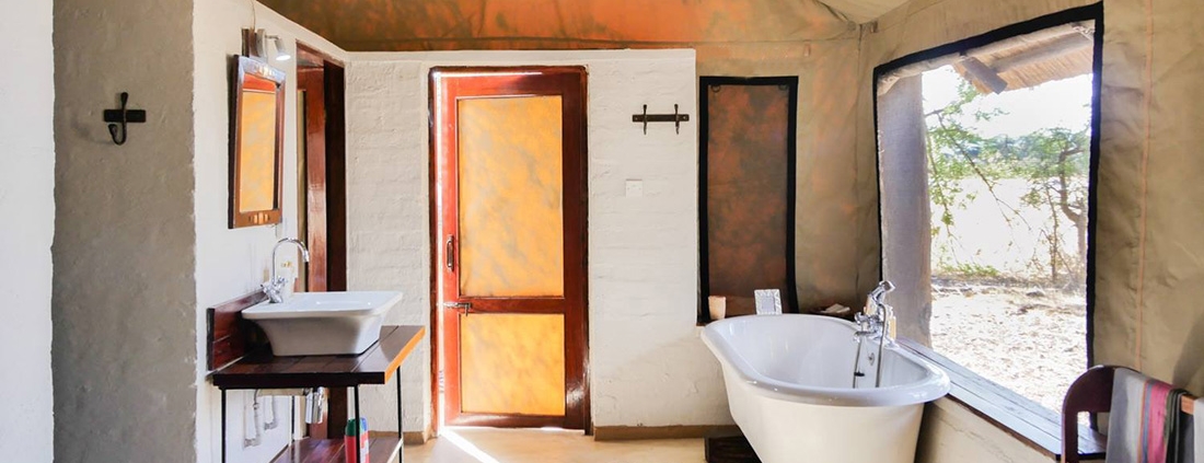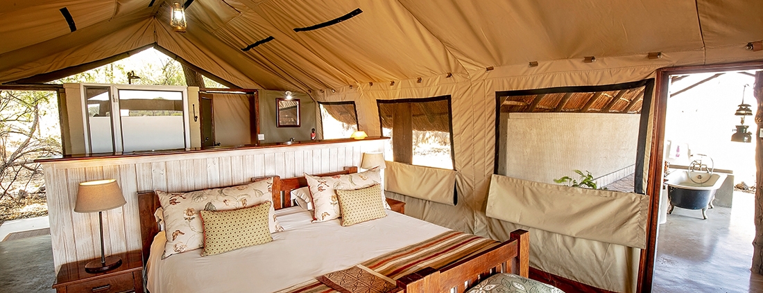 The Hide tiene capacidad para 20 personas en 10 cómodas y espaciosas tiendas de lujo, familiares de lujo y de luna de miel de lujo. Las tiendas tienen una gran variedad de configuraciones diferentes con bañeras y duchas interiores y / o exteriores. Están refrigerados por ventilador para su comodidad en verano y tienen mantas extra cálidas y bolsas de agua caliente para los fríos meses de invierno. Cada uno tiene una terraza privada desde donde los huéspedes pueden entretenerse con las idas y venidas de una gran variedad de animales en el cercano estanque de agua.