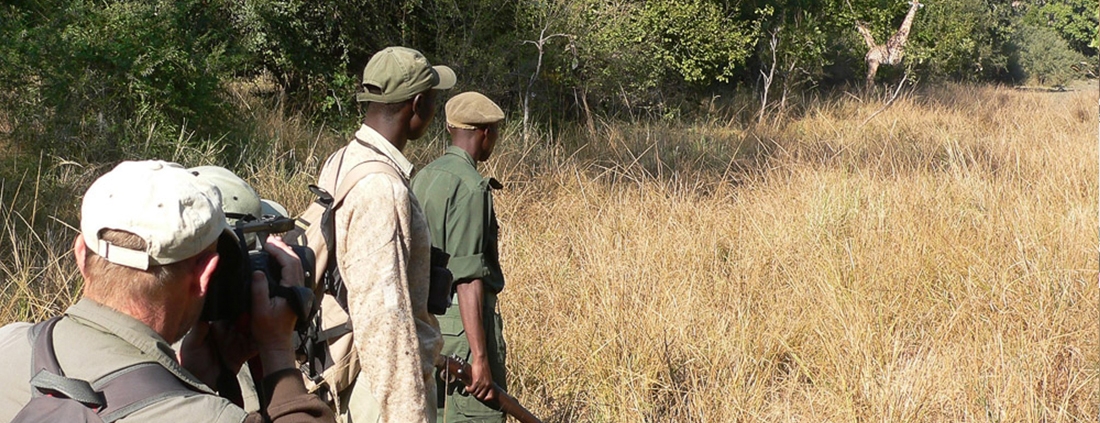 Los safaris a pie, los cuales siempre se realizan con guías certificados y rastreadores armados, aportan una experiencia diferente al safari en vehículo 4×4, centrándose en animales más pequeños, insectos, aves y flora. A menudo se ven animales más grandes, como elefantes, jirafas, antílopes y ocasionalmente depredadores como leones, leopardos y perros salvajes. Por seguridad No se permiten menores de 12 años en los safaris a pie.