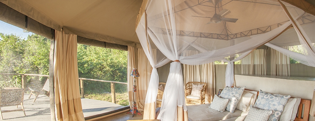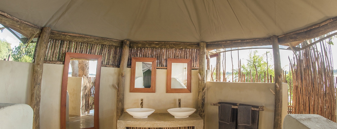 Three Rivers Camp cuenta con 5 tiendas de lujo, elegantemente decoradas con tonos y materiales en completa armonía con la natiraleza. El dormitorio es muy espacioso con dos camas individuales y una sala de estar, grandes ventanas con vistas al río Luangwa o la laguna.