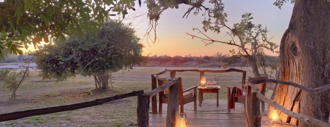 En la puerta de cada chalet hay una terraza con vistas al bush y los puntos de agua de los alrededores del río Luwi.