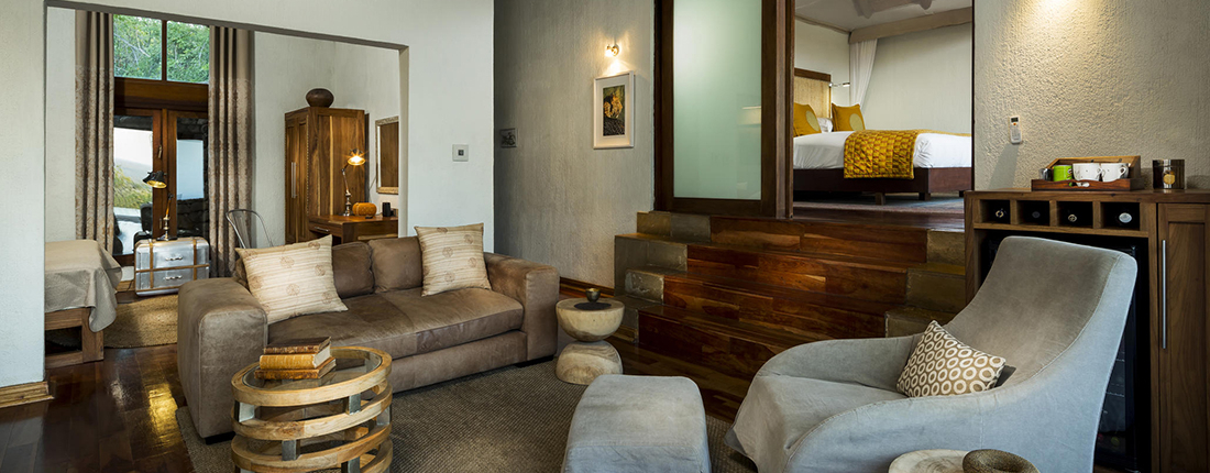 La Rock Suite mide aproximadamente 125 m2. Una espaciosa suite de dos dormitorios con sala de estar. El dormitorio principal tiene tiene una cama King Size (que se puede dividir en gemelos) y un baño completo y vistas a la sabana boscosa. La segunda habitación con cama tamaño Queen, que no se puede dividir, tambien cuenta con un baño privado algo más pequeño (solo con ducha). Es la suite familiar y tiene capacidad para 2 adultos y 2 niños (menores de 12 años). La suite cuenta con aire acondicionado, ventiladores de techo y mosquiteras. Su balcón privado tiene puertas que dan al dormitorio principal y al salón.